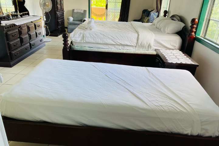 Located upstairs, our spacious Master Suite features an extra-large King bed and a single bed. Relax with a TV, coffee table, and a cozy small sofa. Step out onto the communal balcony for a breath of fresh air. While there's no air conditioning, a fan is provided to keep you comfortable. Enjoy the convenience of a private ensuite with a shower and toilet. A perfect room for a relaxing stay!